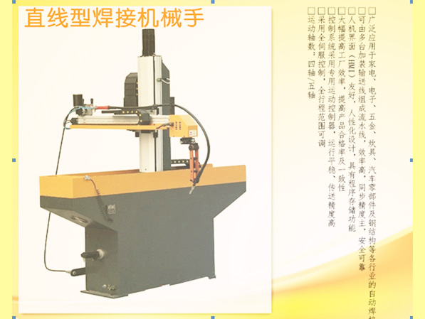 全自动直线型鼎博国际app下载焊接机械手,直线型焊接机器人广泛应用于焊接家具配件、汽车配件、保险柜等五金制造领域。本产品移定性好,精度高、效率高,操作简便。