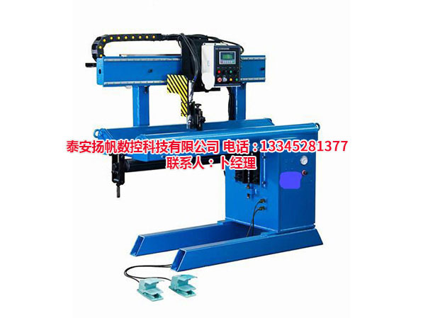 5、焊枪行走机构,在底座侧面固定横梁,横梁侧面固定方形导轨及精密滚珠丝杠,焊枪行走机构在横梁导轨上移动,由步进电机提供动力,再经丝杠副等实现直线运动,其行走速度可调。行走机构位置及距离的设定,可根据需要移动位于横梁上面的接近开关来实现。