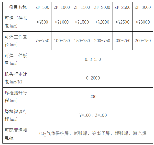应用范围:技术参数项目名称ZF-500ZF-1000ZF-1500ZF-2000ZF-2500ZF-3000可焊工件长度(mm)≤500≤1000≤1500≤2000≤2500≤3000可焊工件直径(mm)75-750100-750150-750200-750200-750200-750可焊工件板厚(mm)0.8-3.0机头行走速度(mm/M)0-2000焊枪提升行程(mm)200焊枪微调行程(mm)Y=1