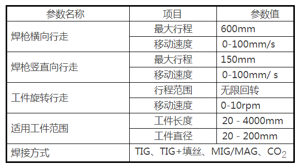 工件装卡采用专用中心定位装置定位,尾座气动顶紧方式;工件回转采用步进电机调速、恒转矩输出,速度平稳;机头横向和纵向移动采用气缸驱动,导轨导向,具有运动平稳、响应速度快;尾座沿纵向可调,可适应多品种焊接。焊接实施等功能均由控制盒的按钮实现,操作简单,便捷,操作采用人机界面可进行参数的更改,参数的修改可通过触摸式按键,方便及时的输入;该山东焊接专机以松下可编程序控制器为核心组成自动焊接控制系统,自动化程度高,提高工作效率,减少焊接变形。