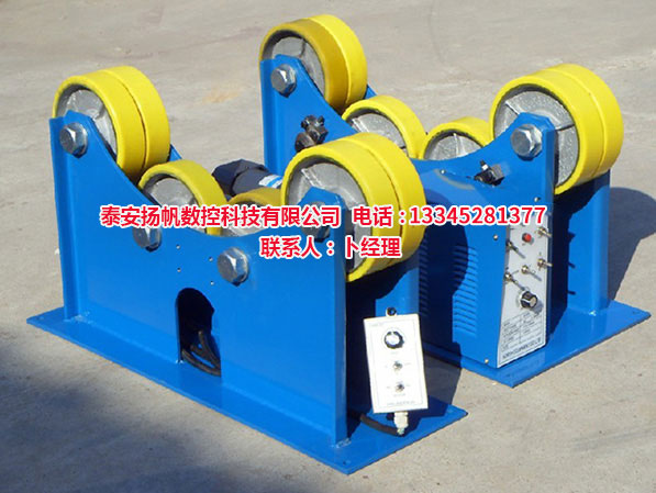 焊接滚轮架,是利用主动滚轮与焊件之间的摩擦力带动工件旋转的变位设备。滚轮架可根据工件直径大小自动调节轮组的摆角,并能自动调心。滚轮架主要用于管道、容器、锅炉、油罐等圆筒形工件的装配或焊接,滚轮架当与焊接山东操作机、焊接电源配套时,可以实现工件的内外纵缝和内外环缝焊接。滚轮架充分吸取了国内外同类产品的优点,具有工艺、质量可靠、操作简单、传动噪声低、工件回转平稳等优点。滚轮架是实现压力容器及筒状工件焊接自动化、半自动化的必备设备。自调式滚轮架滚轮驱动采用变频调速电动机,可按焊接规范进行无极调速,具有焊接速度调速范围宽、转动平滑性好、低速特性硬等特点。当对主、从滚轮架的高度作适当的调整后,也可进行锥体、分段不等径回转体的装配与焊接。对于一些非圆长形焊件,若将其卡在特制的环形卡箍内,也可在焊接滚轮架上进行装焊作业。特别是自调式、可调式焊接滚轮架系列